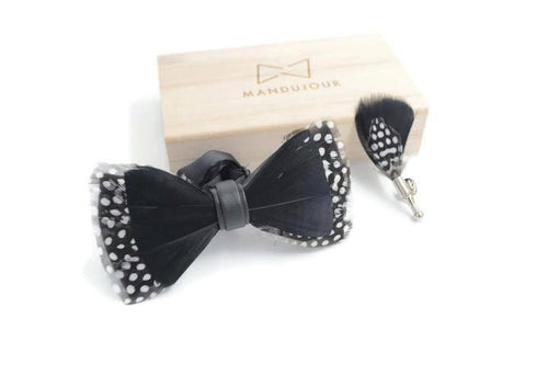 Make a bold statement with the Mandujour Black Polka-Dot Guinea Feather Bow Tie and Lapel Pin Set.