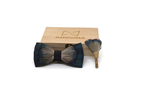 Channel the majestic spirit of the peacock with the Mandujour "Denver Blues" Feather Bow Tie and Lapel Pin Set.