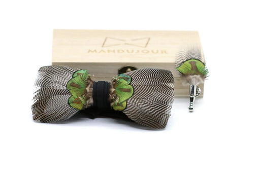 Make a refined statement with the Mandujour Jacksonville Grey-Green Feather Bow Tie and Lapel Pin Set.