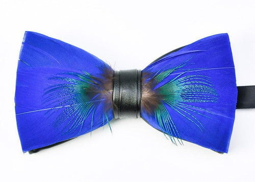 Each feather is meticulously selected and arranged by our skilled artisans, creating a bow tie and lapel pin set that is both striking and elegant. The brilliant blue of the macaw feathers, reminiscent of clear tropical skies, contrasts beautifully with the iridescent greens of the peacock feathers, creating a captivating visual tapestry.