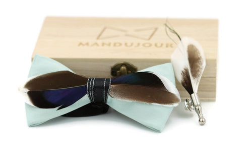 Make a splash with the Mandujour Mallard Duck Feather Bow Tie and Lapel Pin Set.