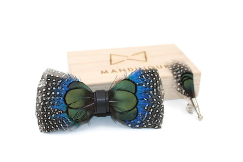 Embrace playful sophistication with the Mandujour Polka Dot Pheasant Feather Bow Tie and Lapel Pin Set.