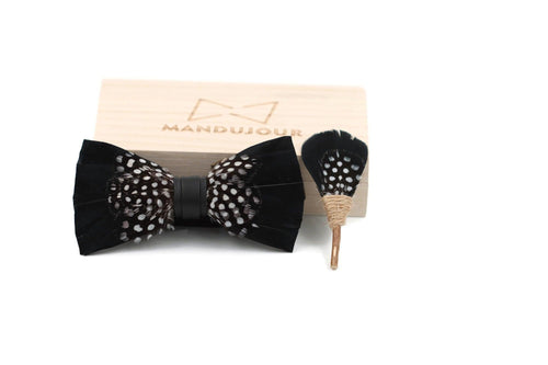 Make a bold statement with the Quisqueya Black Polka Dot Goose Feather Bow Tie & Lapel Pin Set from Mandujour.