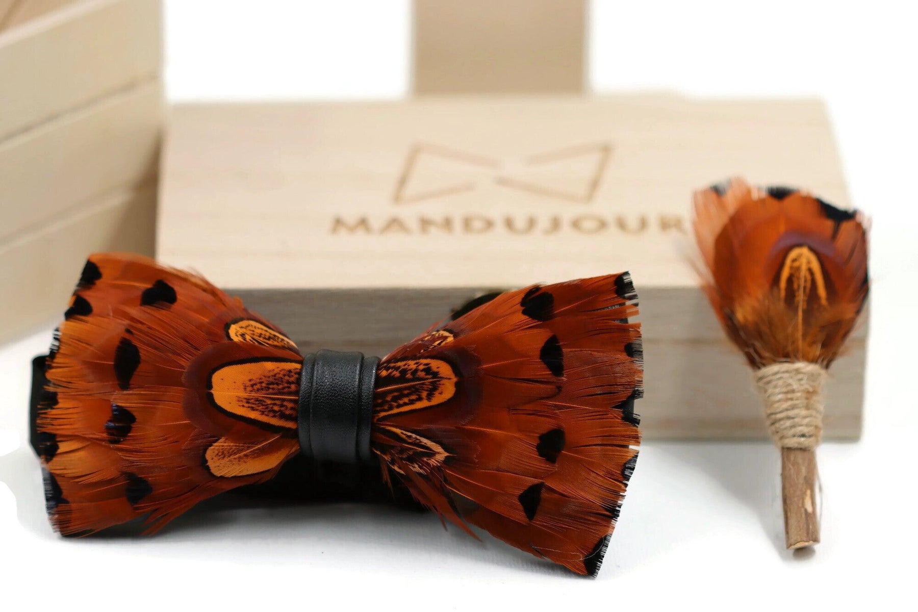 Orange Feather Bow Tie & Lapel Pin Set for Grooms, Weddings, Formal Events - Unique Mens Accessory
